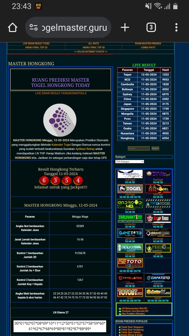 MASTER HONGKONG Rabu, 29-04-2026 Merupakan Prediksi Otomatis yang menggabungkan Metode Kalender Togel Dengan Rumus-rumus kontrol yang sudah terbukti keakuratanya.Gunakan Aplikasi Rekap untuk mendapatkan LN TOP. Harap Maklum Jika kadang meleset MASTER HONGKONG kita. Jadikan ini sebagai perbandingan saja dan tetap UPS