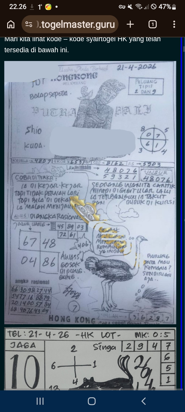 MASTER HONGKONG Minggu, 26-04-2026 Merupakan Prediksi Otomatis yang menggabungkan Metode Kalender Togel Dengan Rumus-rumus kontrol yang sudah terbukti keakuratanya.Gunakan Aplikasi Rekap untuk mendapatkan LN TOP. Harap Maklum Jika kadang meleset MASTER HONGKONG kita. Jadikan ini sebagai perbandingan saja dan tetap UPS