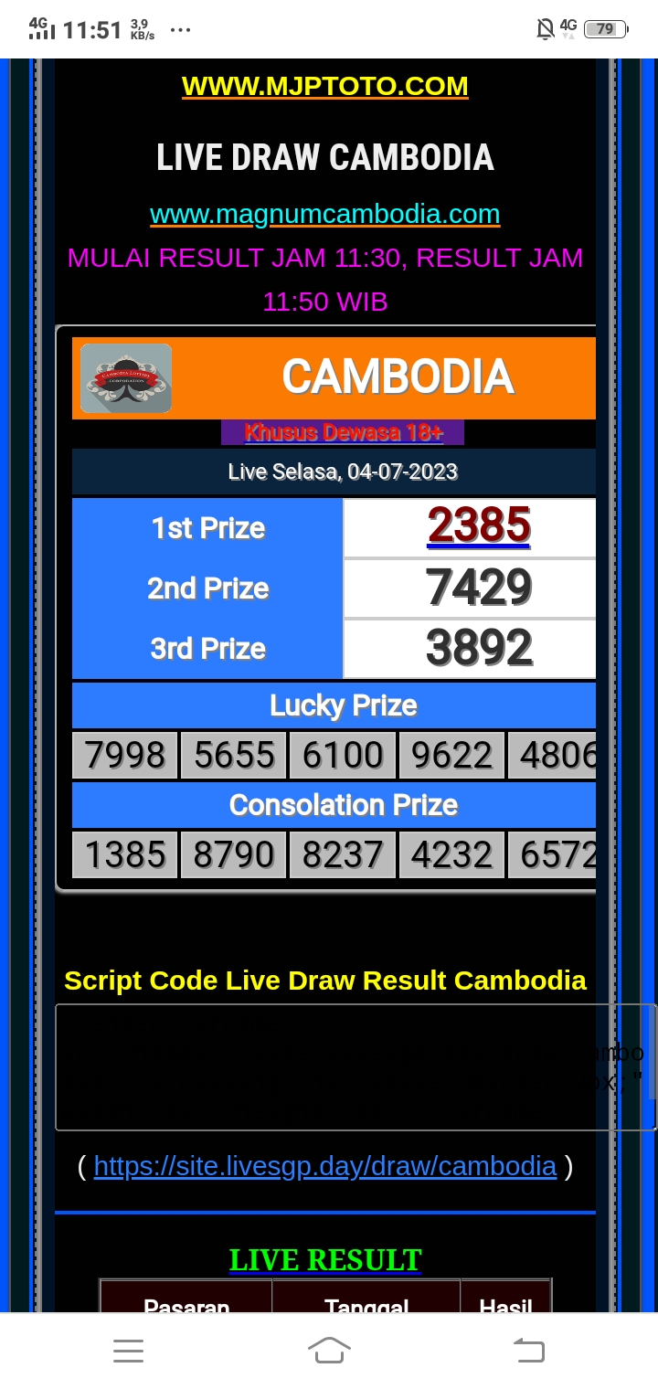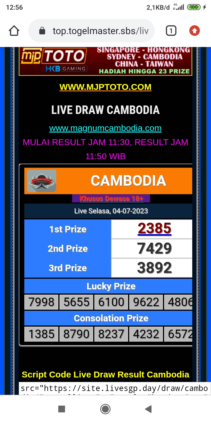 MASTER CAMBODIA Minggu, 26-04-2026 Merupakan Prediksi Otomatis yang menggabungkan Metode Kalender Togel Dengan Rumus-rumus kontrol yang sudah terbukti keakuratanya.Gunakan Aplikasi Rekap untuk mendapatkan LN TOP. Harap Maklum Jika kadang meleset MASTER CAMBODIA kita. Jadikan ini sebagai perbandingan saja dan tetap UPS