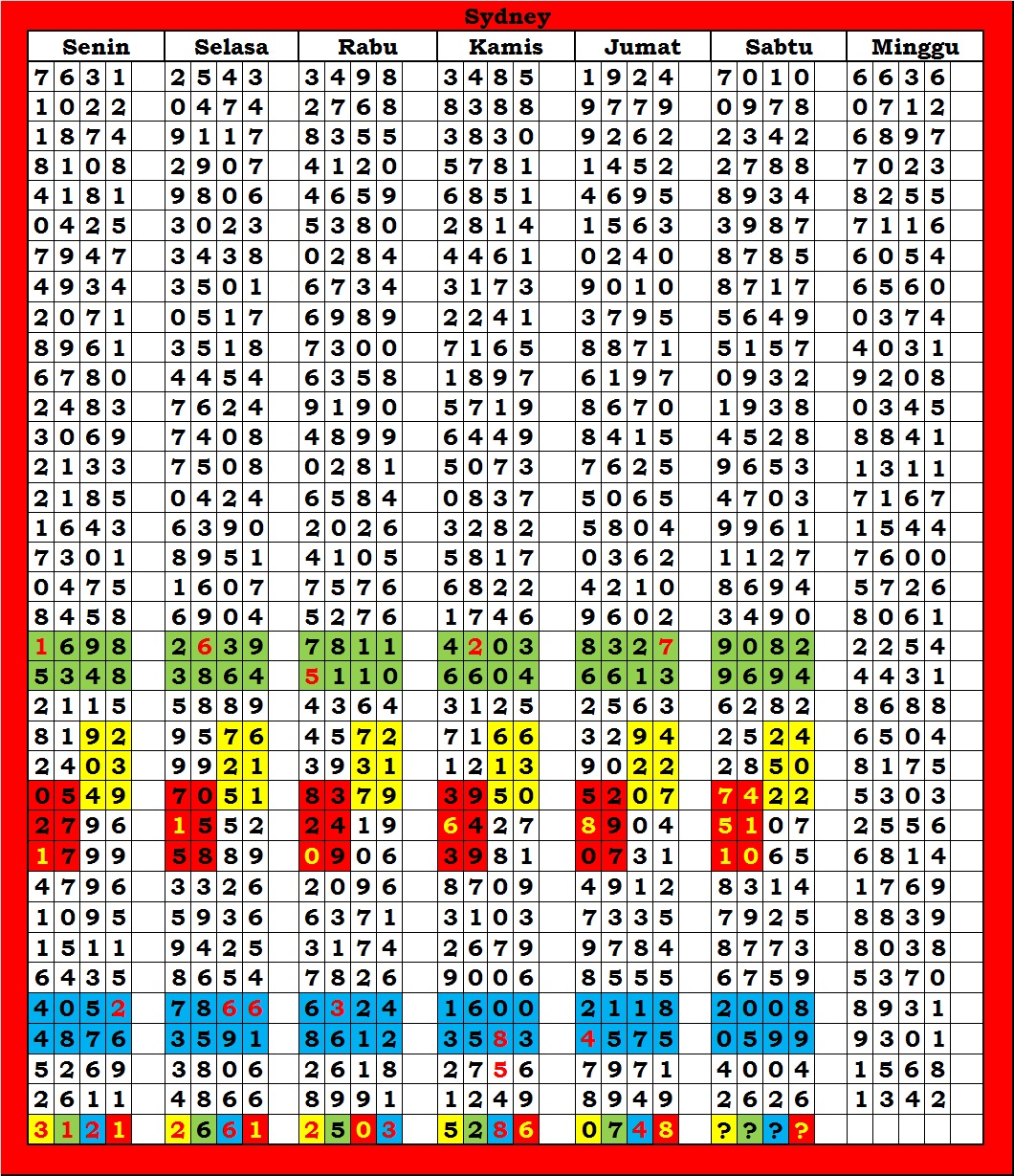 MASTER SYDNEY Rabu, 29-04-2026 Merupakan Prediksi Otomatis yang menggabungkan Metode Kalender Togel Dengan Rumus-rumus kontrol yang sudah terbukti keakuratanya.Gunakan Aplikasi Rekap untuk mendapatkan LN TOP. Harap Maklum Jika kadang meleset MASTER SYDNEY kita. Jadikan ini sebagai perbandingan saja dan tetap UPS