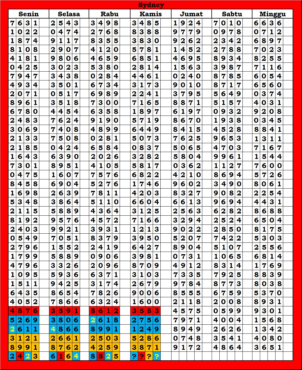 MASTER SYDNEY Rabu, 29-04-2026 Merupakan Prediksi Otomatis yang menggabungkan Metode Kalender Togel Dengan Rumus-rumus kontrol yang sudah terbukti keakuratanya.Gunakan Aplikasi Rekap untuk mendapatkan LN TOP. Harap Maklum Jika kadang meleset MASTER SYDNEY kita. Jadikan ini sebagai perbandingan saja dan tetap UPS