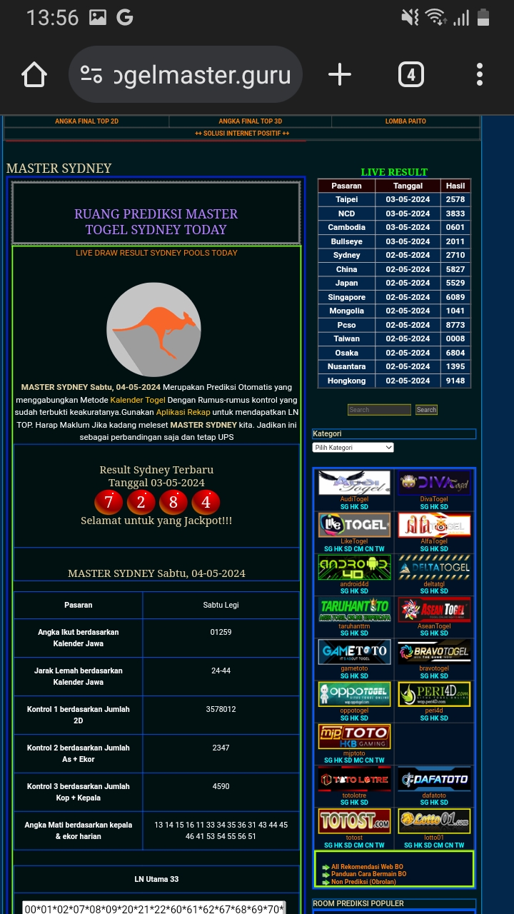 MASTER SYDNEY Selasa, 28-04-2026 Merupakan Prediksi Otomatis yang menggabungkan Metode Kalender Togel Dengan Rumus-rumus kontrol yang sudah terbukti keakuratanya.Gunakan Aplikasi Rekap untuk mendapatkan LN TOP. Harap Maklum Jika kadang meleset MASTER SYDNEY kita. Jadikan ini sebagai perbandingan saja dan tetap UPS