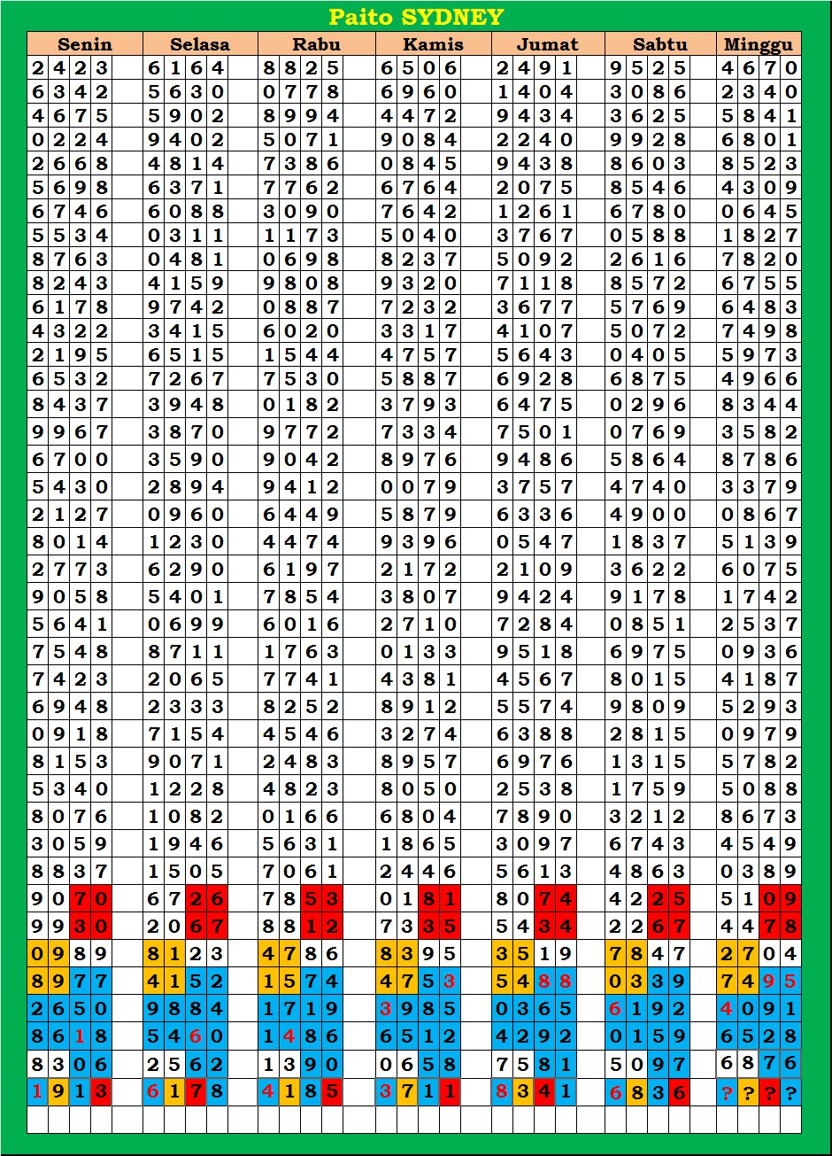 MASTER SYDNEY Senin, 27-04-2026 Merupakan Prediksi Otomatis yang menggabungkan Metode Kalender Togel Dengan Rumus-rumus kontrol yang sudah terbukti keakuratanya.Gunakan Aplikasi Rekap untuk mendapatkan LN TOP. Harap Maklum Jika kadang meleset MASTER SYDNEY kita. Jadikan ini sebagai perbandingan saja dan tetap UPS