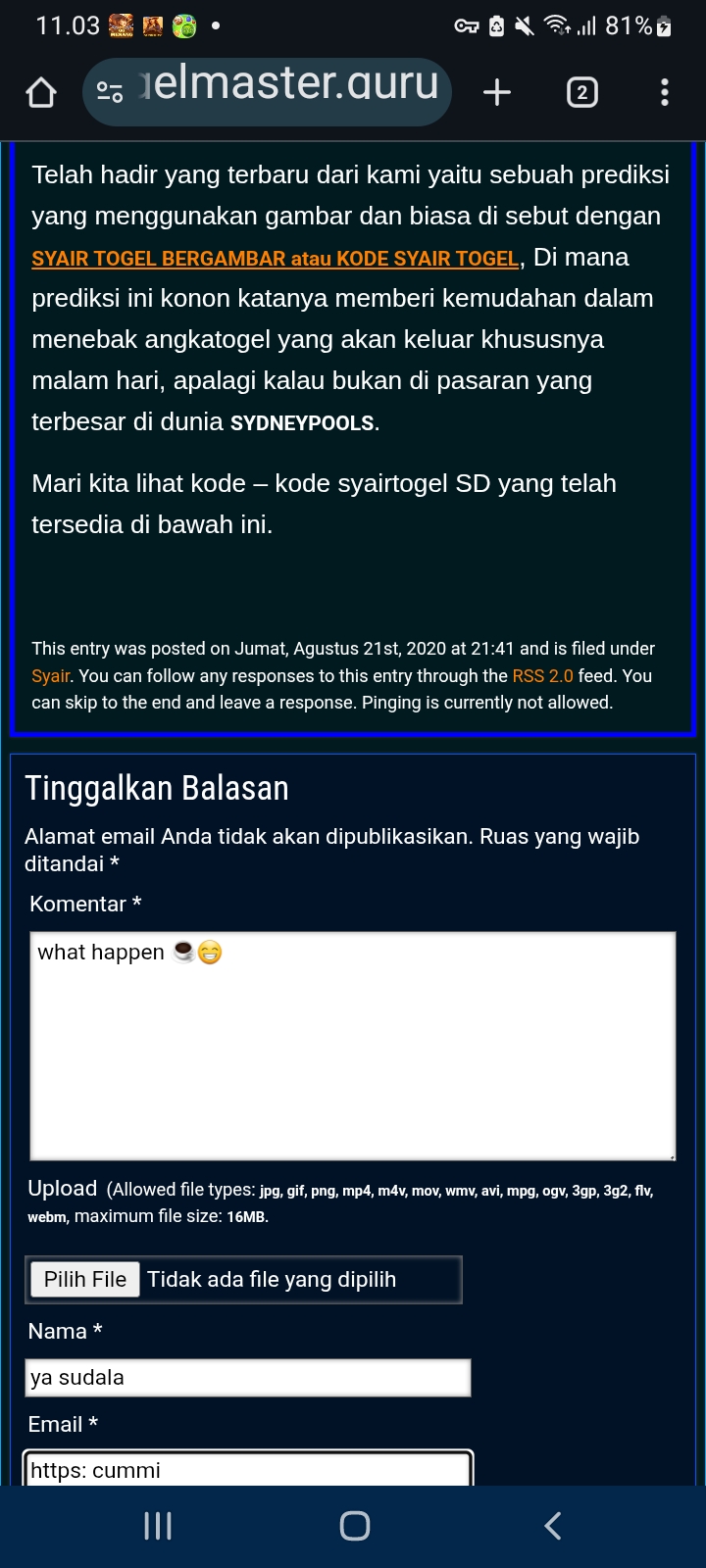 Demikian informasinya untuk mencari postingan sebelumnya.Posting komentar telah kami setting akan langsung publish jika posting komentar sebelumnya telah diaprove oleh admin, dan jika setiap posting selalu moderasi (minta persetujuan admin) berarti nickname atau emailnya tidak support, silahkan ganti nickname dan emailnya dengan yang lain yang tersupport, disarankan untuk gunakan nickname dan email postingan tidak menggunakan nama konotatif (spam) serta kontras ke bahasa indonesia karena blog ini kami setting dengan komentar dari visitor indonesia, serta berkomentar dengan bahasa yang baik tidak mengandung text konotatif atau text yang biasa digunakan penjual jamu (spam) karena plugin akismet akan moderasikan semua postingan yang sering ditandakan spam oleh pengguna wordpress, dan disarankan juga bikin gravatar agar postingannya lebih valid, pelajari cara bikin gravatar di http://togelmaster.info/gravatar.