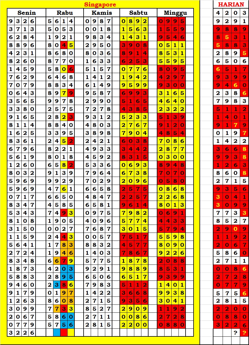 MASTER SINGAPURA Rabu, 29-04-2026 Merupakan Prediksi Otomatis yang menggabungkan Metode Kalender Togel Dengan Rumus-rumus kontrol yang sudah terbukti keakuratanya.Gunakan Aplikasi Rekap untuk mendapatkan LN TOP. Harap Maklum Jika kadang meleset MASTER SINGAPURA kita. Jadikan ini sebagai perbandingan saja dan tetap UPS