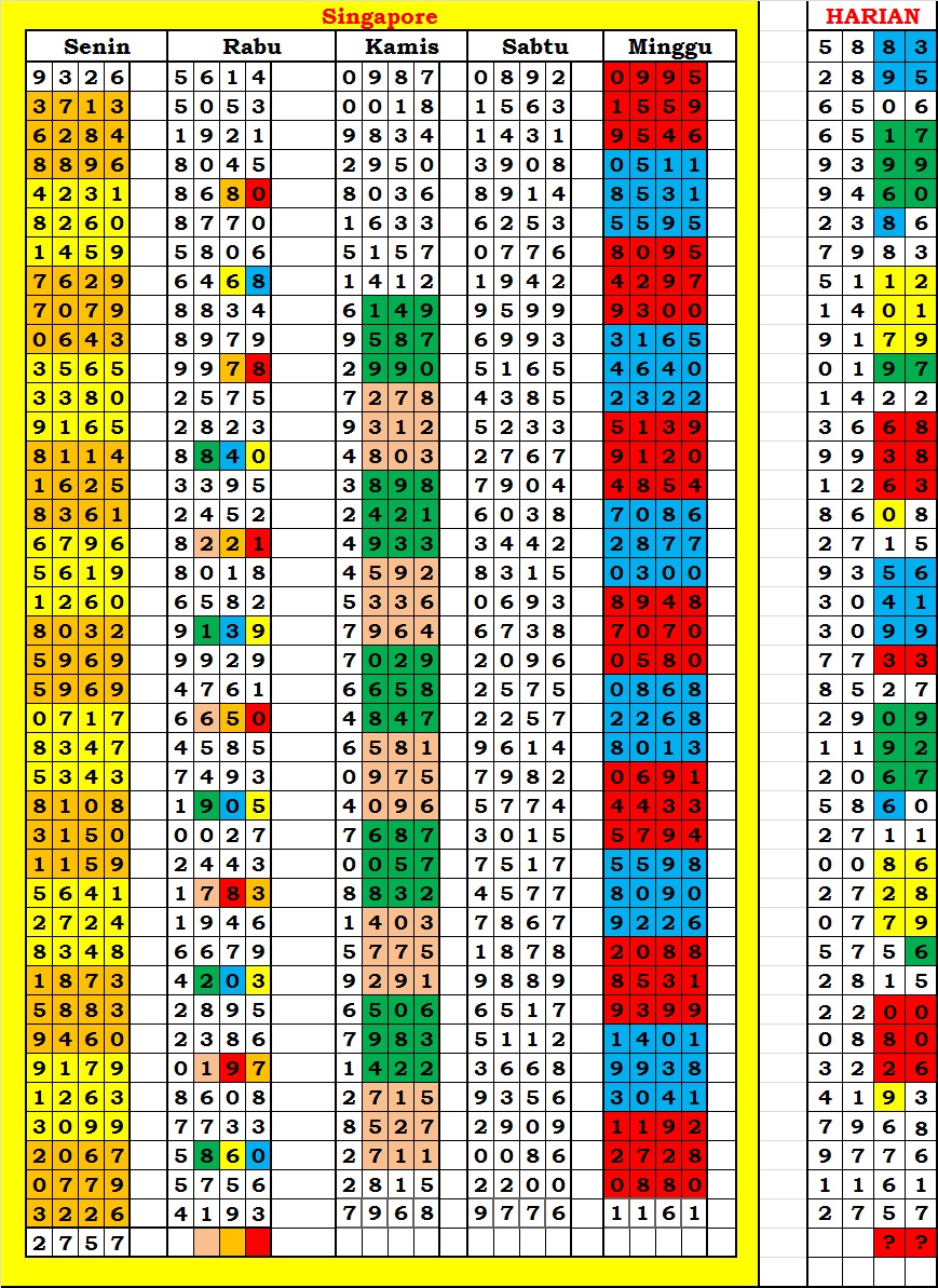MASTER SINGAPURA Rabu, 29-04-2026 Merupakan Prediksi Otomatis yang menggabungkan Metode Kalender Togel Dengan Rumus-rumus kontrol yang sudah terbukti keakuratanya.Gunakan Aplikasi Rekap untuk mendapatkan LN TOP. Harap Maklum Jika kadang meleset MASTER SINGAPURA kita. Jadikan ini sebagai perbandingan saja dan tetap UPS