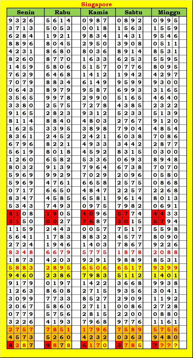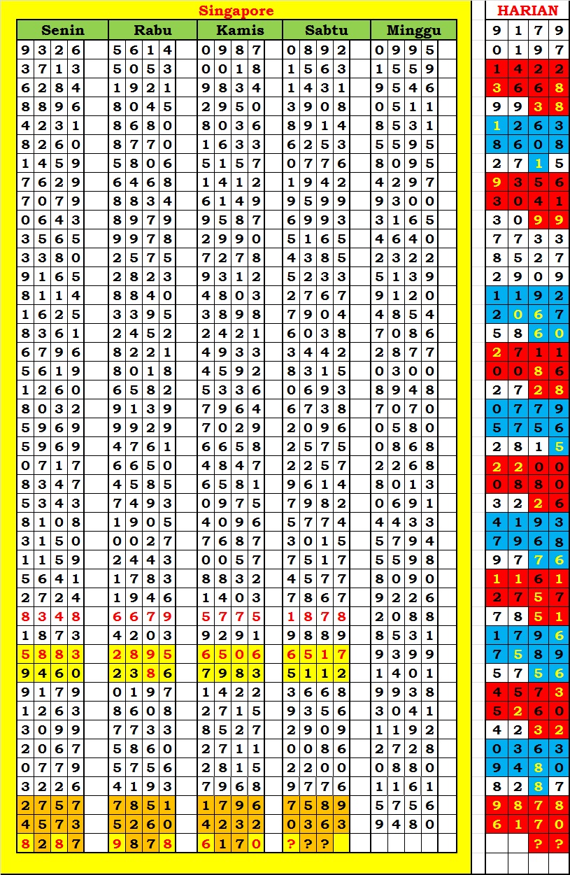 MASTER SINGAPURA Rabu, 29-04-2026 Merupakan Prediksi Otomatis yang menggabungkan Metode Kalender Togel Dengan Rumus-rumus kontrol yang sudah terbukti keakuratanya.Gunakan Aplikasi Rekap untuk mendapatkan LN TOP. Harap Maklum Jika kadang meleset MASTER SINGAPURA kita. Jadikan ini sebagai perbandingan saja dan tetap UPS