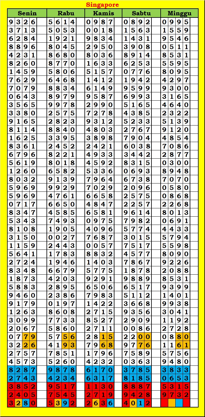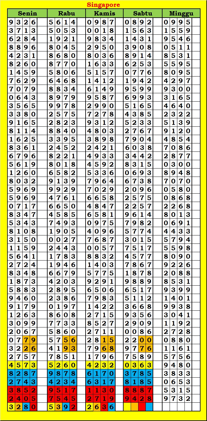MASTER SINGAPURA Rabu, 29-04-2026 Merupakan Prediksi Otomatis yang menggabungkan Metode Kalender Togel Dengan Rumus-rumus kontrol yang sudah terbukti keakuratanya.Gunakan Aplikasi Rekap untuk mendapatkan LN TOP. Harap Maklum Jika kadang meleset MASTER SINGAPURA kita. Jadikan ini sebagai perbandingan saja dan tetap UPS