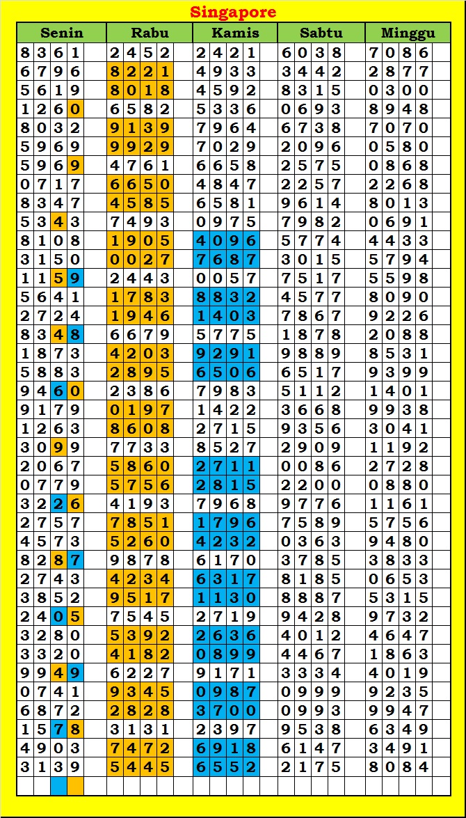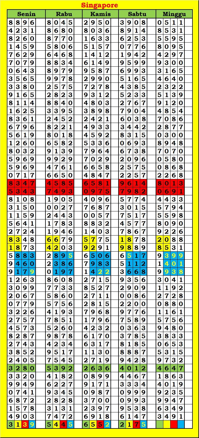 MASTER SINGAPURA Rabu, 29-04-2026 Merupakan Prediksi Otomatis yang menggabungkan Metode Kalender Togel Dengan Rumus-rumus kontrol yang sudah terbukti keakuratanya.Gunakan Aplikasi Rekap untuk mendapatkan LN TOP. Harap Maklum Jika kadang meleset MASTER SINGAPURA kita. Jadikan ini sebagai perbandingan saja dan tetap UPS