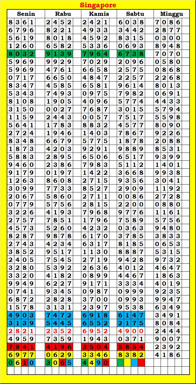 MASTER SINGAPURA Rabu, 29-04-2026 Merupakan Prediksi Otomatis yang menggabungkan Metode Kalender Togel Dengan Rumus-rumus kontrol yang sudah terbukti keakuratanya.Gunakan Aplikasi Rekap untuk mendapatkan LN TOP. Harap Maklum Jika kadang meleset MASTER SINGAPURA kita. Jadikan ini sebagai perbandingan saja dan tetap UPS