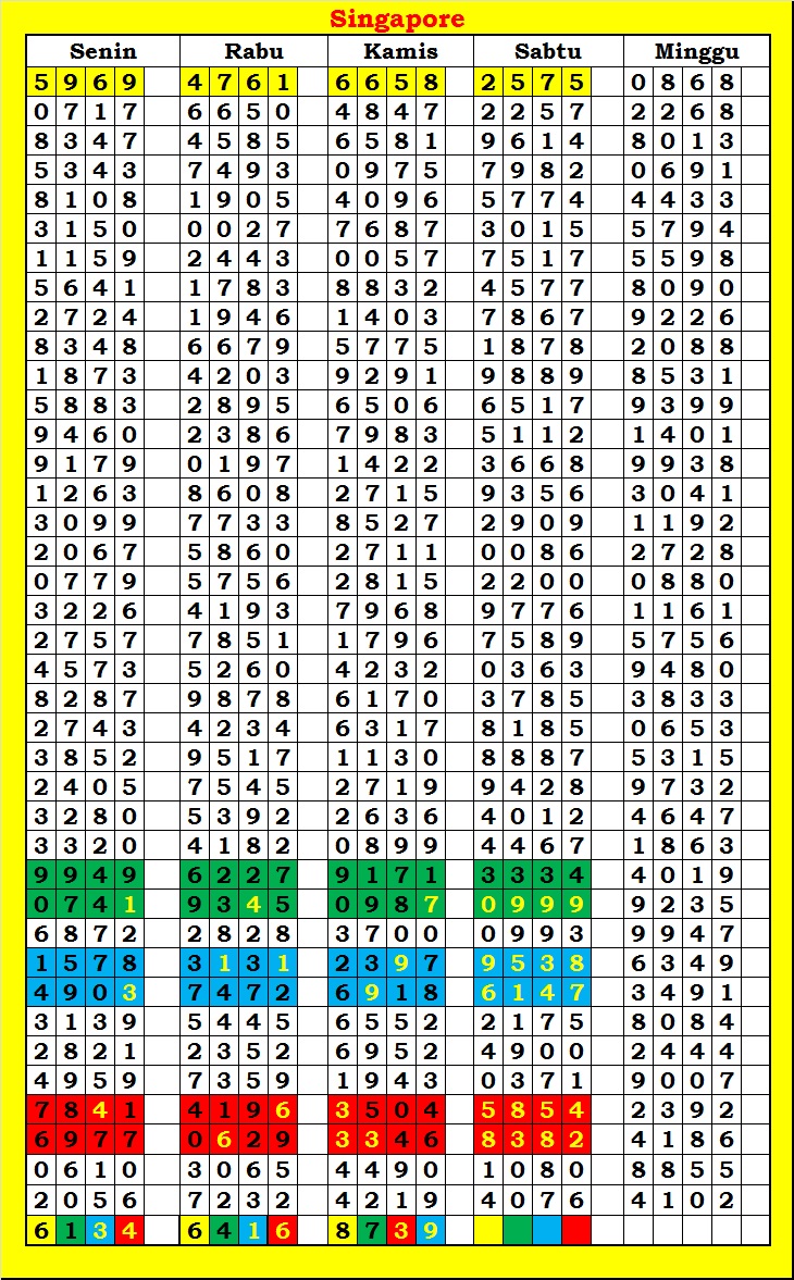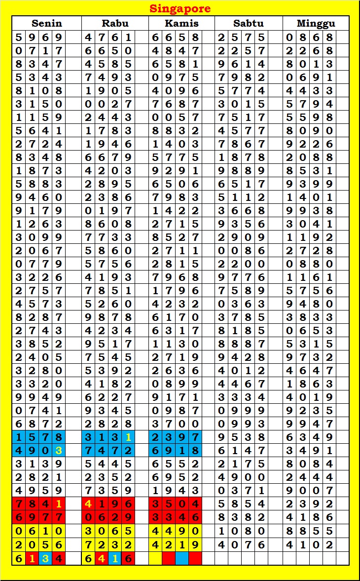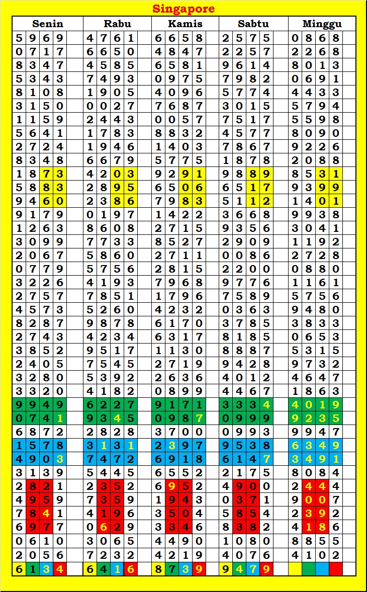 MASTER SINGAPURA Rabu, 29-04-2026 Merupakan Prediksi Otomatis yang menggabungkan Metode Kalender Togel Dengan Rumus-rumus kontrol yang sudah terbukti keakuratanya.Gunakan Aplikasi Rekap untuk mendapatkan LN TOP. Harap Maklum Jika kadang meleset MASTER SINGAPURA kita. Jadikan ini sebagai perbandingan saja dan tetap UPS