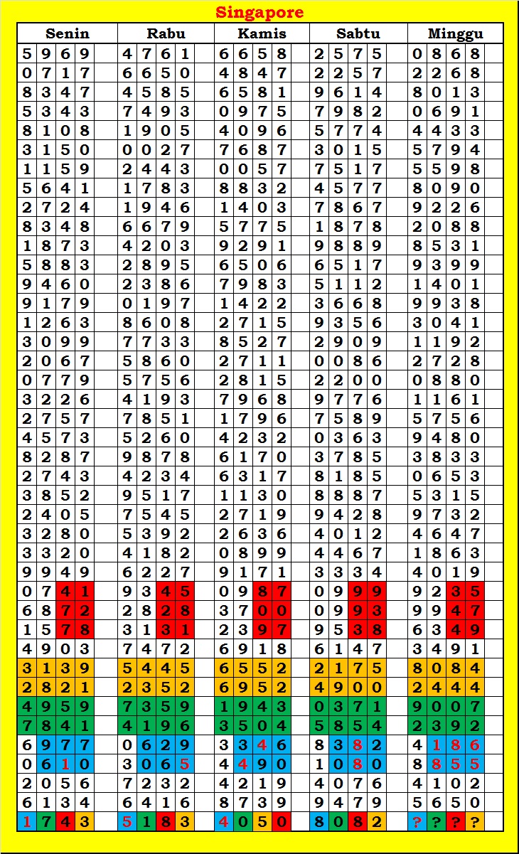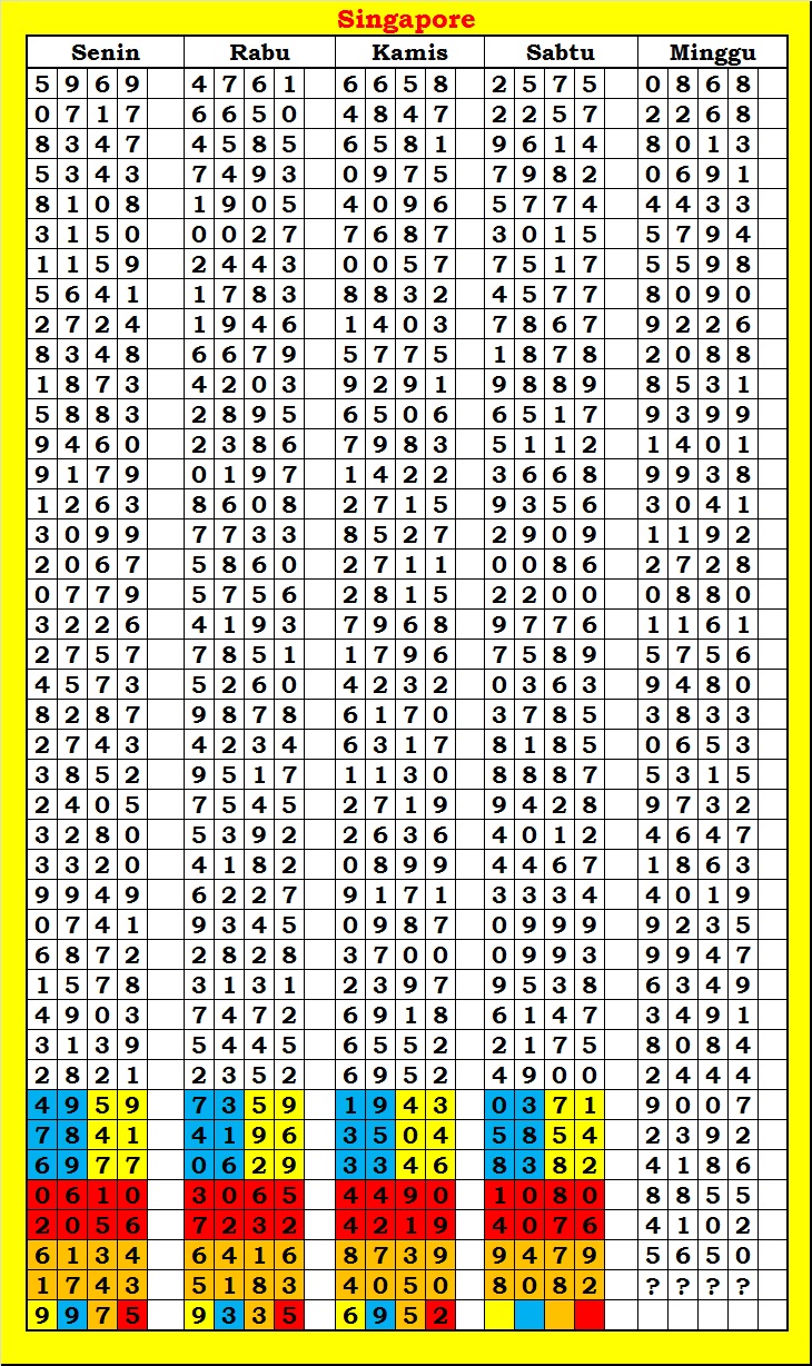 MASTER SINGAPURA Rabu, 22-04-2026 Merupakan Prediksi Otomatis yang menggabungkan Metode Kalender Togel Dengan Rumus-rumus kontrol yang sudah terbukti keakuratanya.Gunakan Aplikasi Rekap untuk mendapatkan LN TOP. Harap Maklum Jika kadang meleset MASTER SINGAPURA kita. Jadikan ini sebagai perbandingan saja dan tetap UPS
