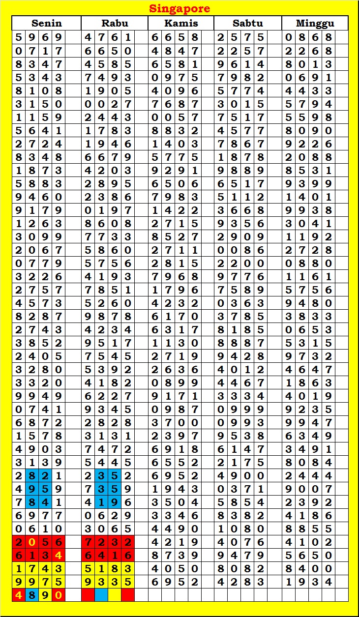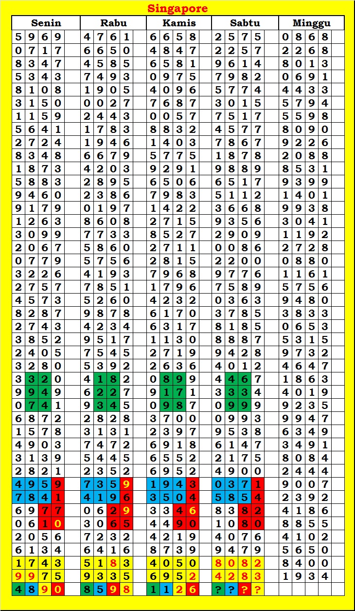 MASTER SINGAPURA Rabu, 29-04-2026 Merupakan Prediksi Otomatis yang menggabungkan Metode Kalender Togel Dengan Rumus-rumus kontrol yang sudah terbukti keakuratanya.Gunakan Aplikasi Rekap untuk mendapatkan LN TOP. Harap Maklum Jika kadang meleset MASTER SINGAPURA kita. Jadikan ini sebagai perbandingan saja dan tetap UPS