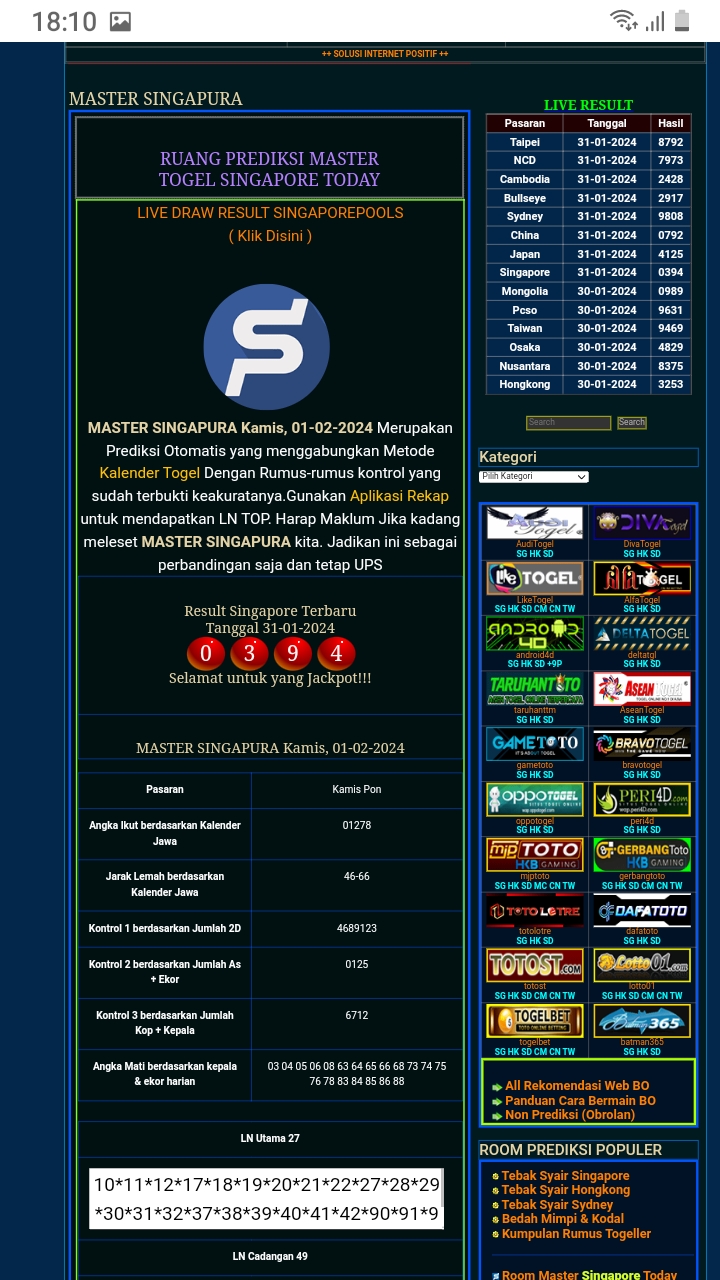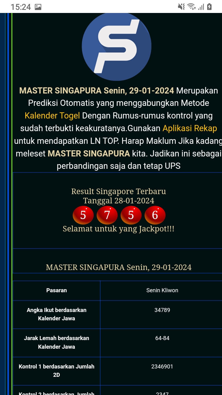 MASTER SINGAPURA Senin, 27-04-2026 Merupakan Prediksi Otomatis yang menggabungkan Metode Kalender Togel Dengan Rumus-rumus kontrol yang sudah terbukti keakuratanya.Gunakan Aplikasi Rekap untuk mendapatkan LN TOP. Harap Maklum Jika kadang meleset MASTER SINGAPURA kita. Jadikan ini sebagai perbandingan saja dan tetap UPS