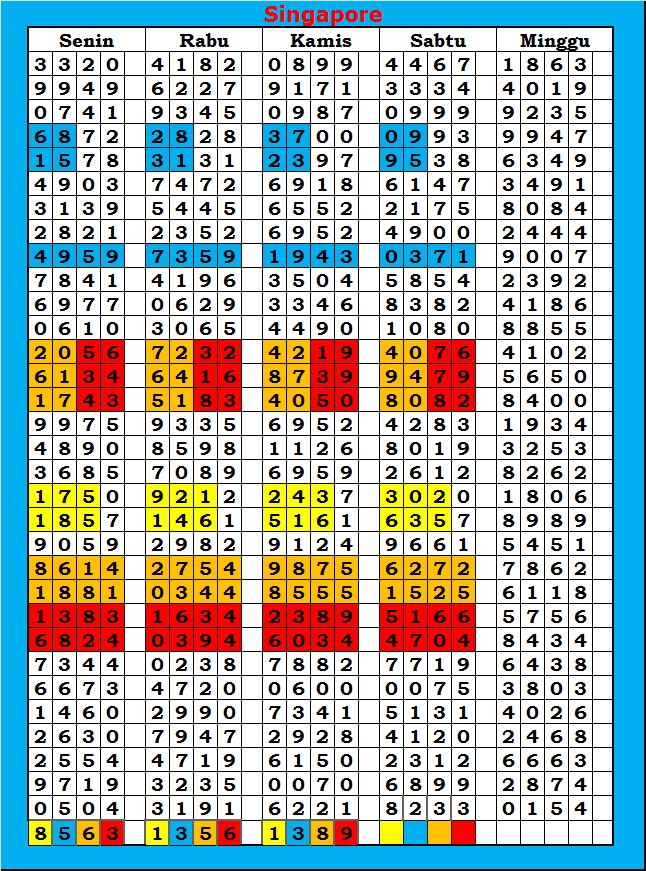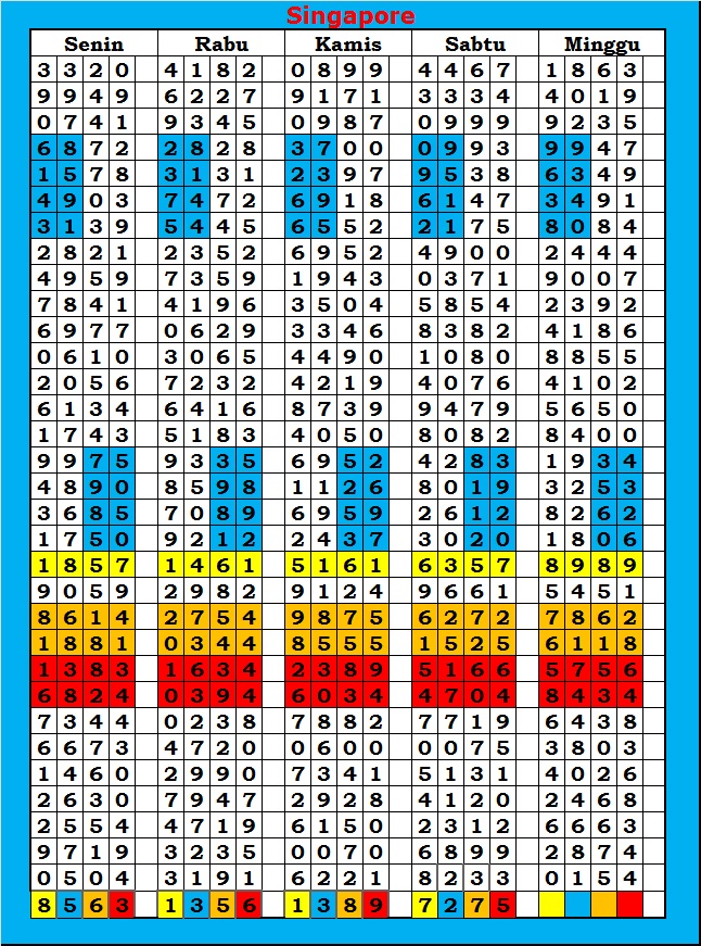 MASTER SINGAPURA Senin, 27-04-2026 Merupakan Prediksi Otomatis yang menggabungkan Metode Kalender Togel Dengan Rumus-rumus kontrol yang sudah terbukti keakuratanya.Gunakan Aplikasi Rekap untuk mendapatkan LN TOP. Harap Maklum Jika kadang meleset MASTER SINGAPURA kita. Jadikan ini sebagai perbandingan saja dan tetap UPS