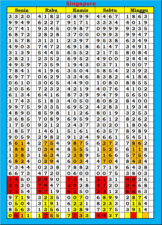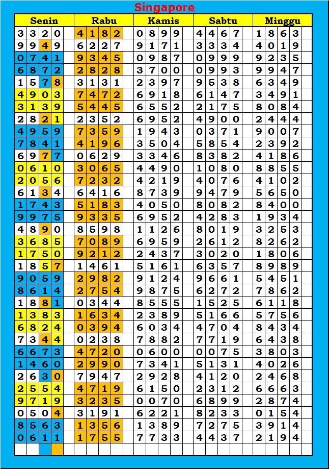 MASTER SINGAPURA Senin, 27-04-2026 Merupakan Prediksi Otomatis yang menggabungkan Metode Kalender Togel Dengan Rumus-rumus kontrol yang sudah terbukti keakuratanya.Gunakan Aplikasi Rekap untuk mendapatkan LN TOP. Harap Maklum Jika kadang meleset MASTER SINGAPURA kita. Jadikan ini sebagai perbandingan saja dan tetap UPS