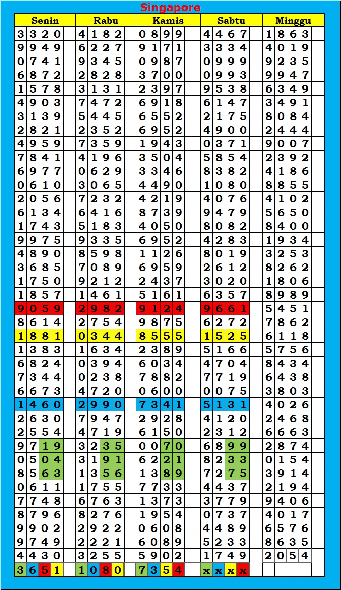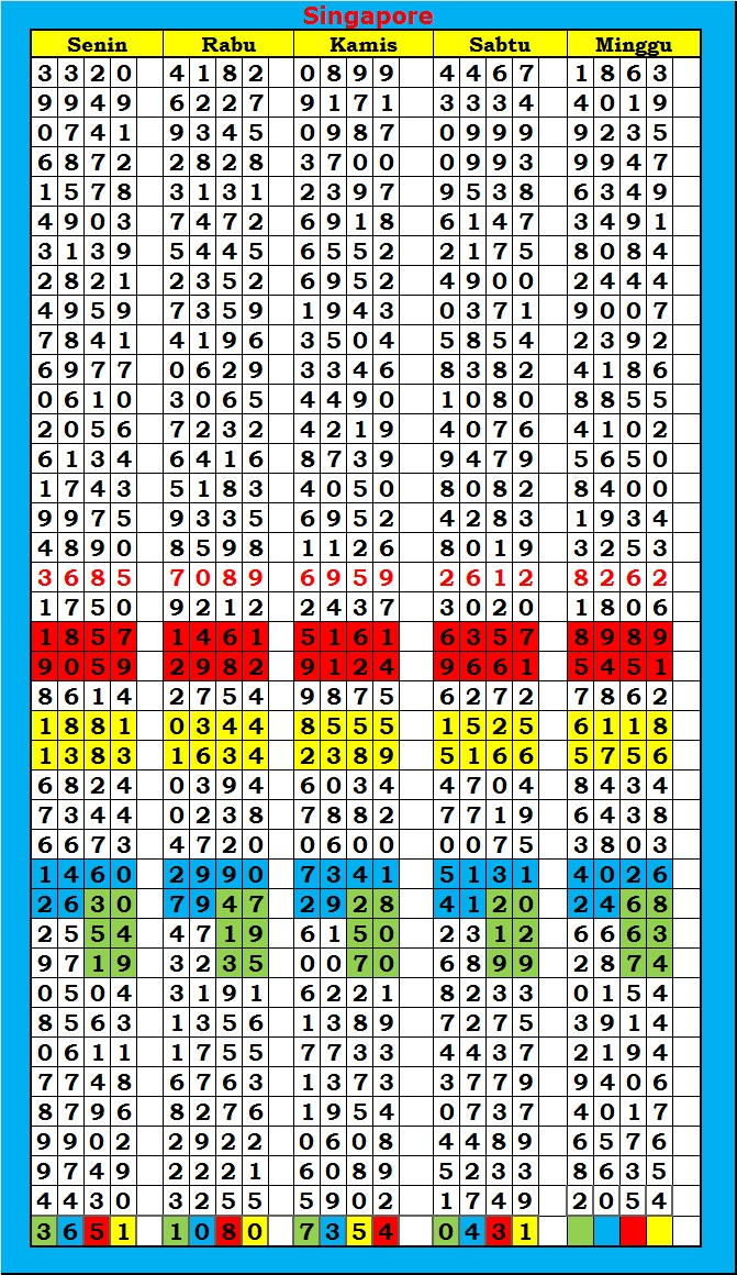 MASTER SINGAPURA Senin, 27-04-2026 Merupakan Prediksi Otomatis yang menggabungkan Metode Kalender Togel Dengan Rumus-rumus kontrol yang sudah terbukti keakuratanya.Gunakan Aplikasi Rekap untuk mendapatkan LN TOP. Harap Maklum Jika kadang meleset MASTER SINGAPURA kita. Jadikan ini sebagai perbandingan saja dan tetap UPS