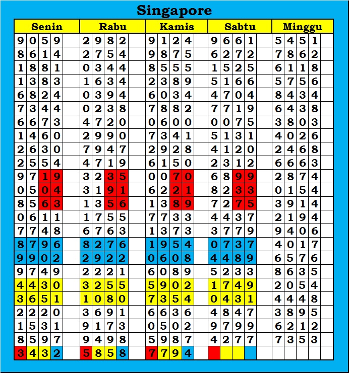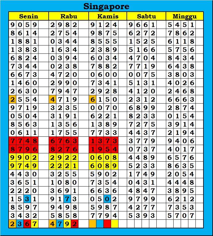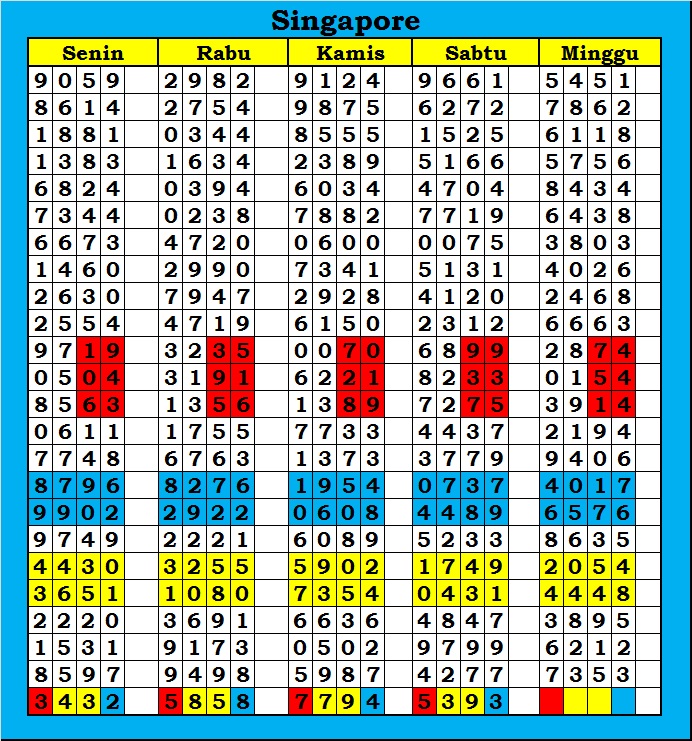 MASTER SINGAPURA Senin, 20-04-2026 Merupakan Prediksi Otomatis yang menggabungkan Metode Kalender Togel Dengan Rumus-rumus kontrol yang sudah terbukti keakuratanya.Gunakan Aplikasi Rekap untuk mendapatkan LN TOP. Harap Maklum Jika kadang meleset MASTER SINGAPURA kita. Jadikan ini sebagai perbandingan saja dan tetap UPS