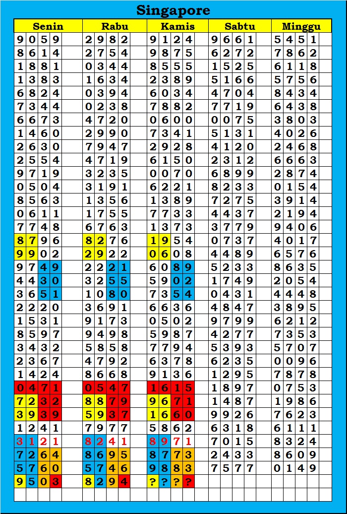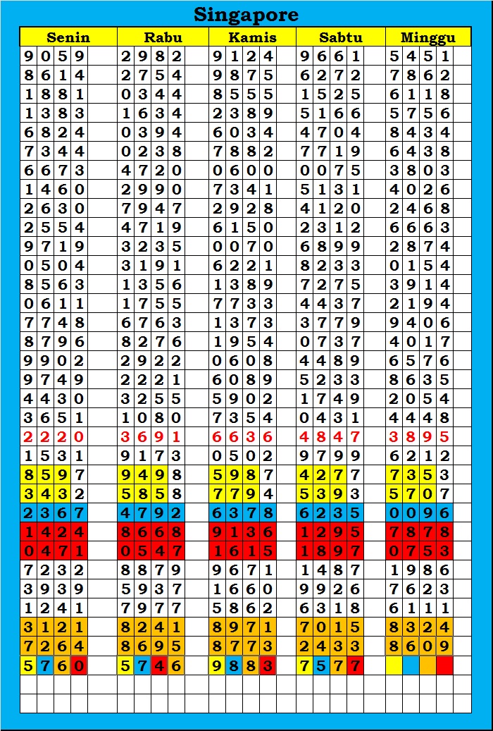 MASTER SINGAPURA Minggu, 26-04-2026 Merupakan Prediksi Otomatis yang menggabungkan Metode Kalender Togel Dengan Rumus-rumus kontrol yang sudah terbukti keakuratanya.Gunakan Aplikasi Rekap untuk mendapatkan LN TOP. Harap Maklum Jika kadang meleset MASTER SINGAPURA kita. Jadikan ini sebagai perbandingan saja dan tetap UPS