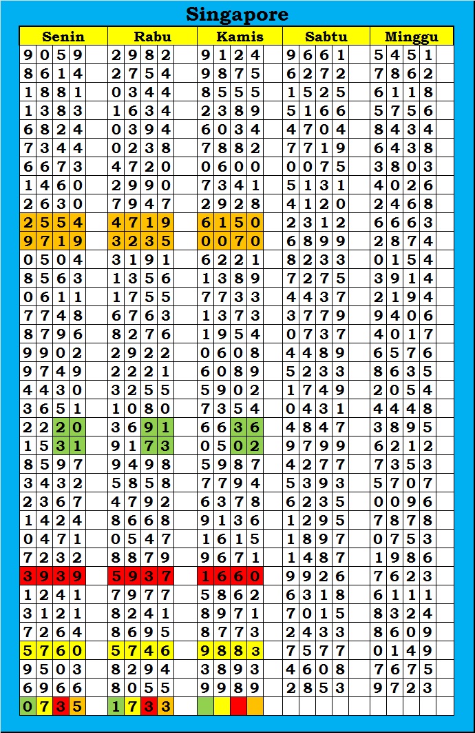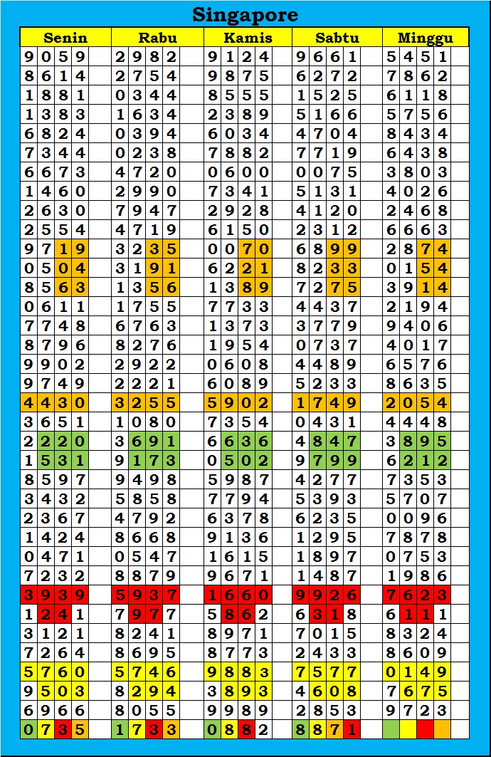 MASTER SINGAPURA Minggu, 26-04-2026 Merupakan Prediksi Otomatis yang menggabungkan Metode Kalender Togel Dengan Rumus-rumus kontrol yang sudah terbukti keakuratanya.Gunakan Aplikasi Rekap untuk mendapatkan LN TOP. Harap Maklum Jika kadang meleset MASTER SINGAPURA kita. Jadikan ini sebagai perbandingan saja dan tetap UPS