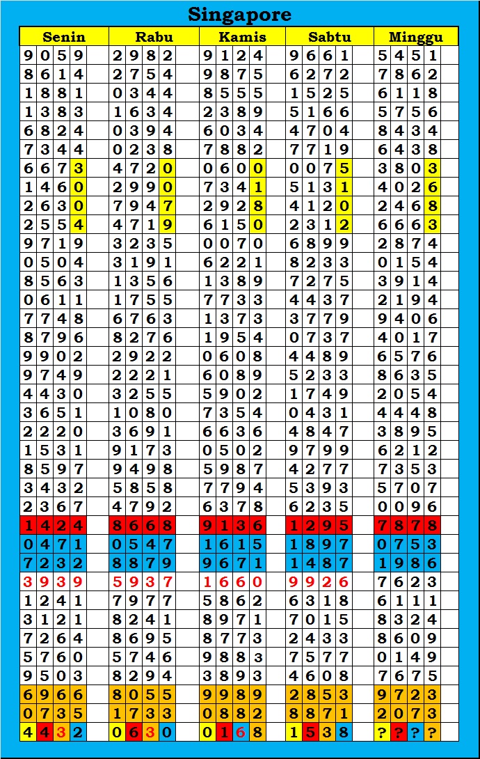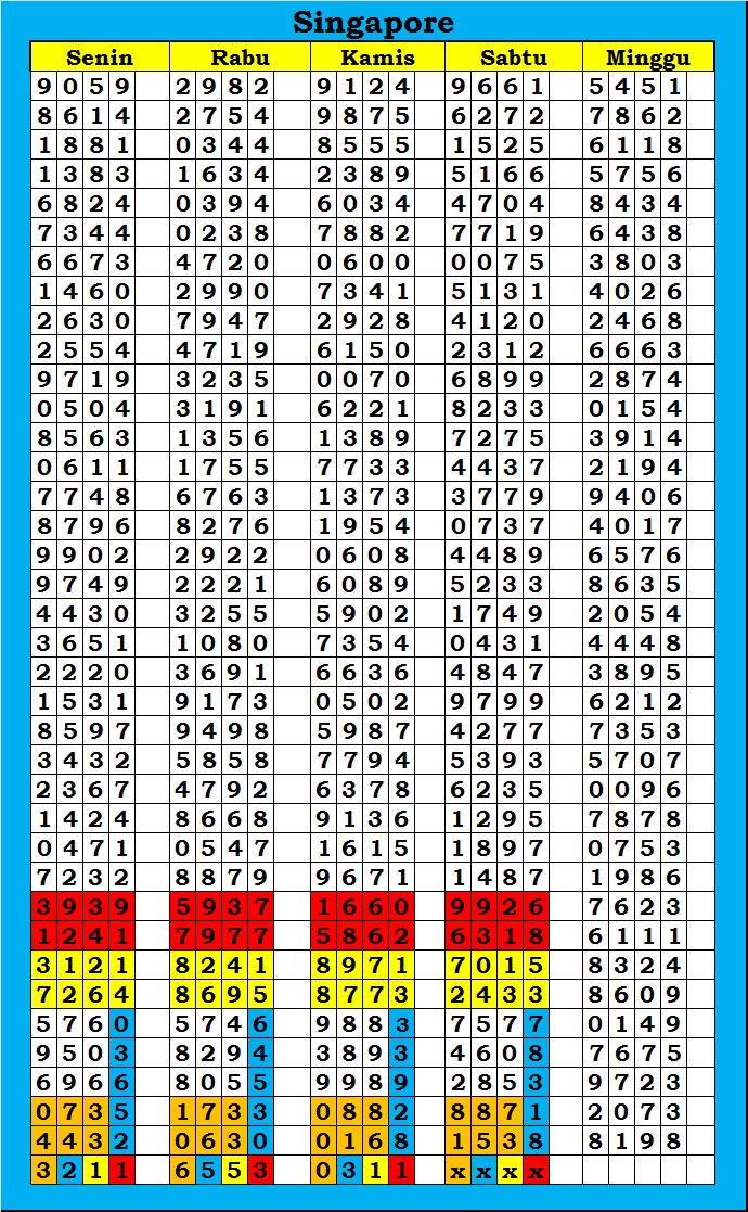 MASTER SINGAPURA Minggu, 26-04-2026 Merupakan Prediksi Otomatis yang menggabungkan Metode Kalender Togel Dengan Rumus-rumus kontrol yang sudah terbukti keakuratanya.Gunakan Aplikasi Rekap untuk mendapatkan LN TOP. Harap Maklum Jika kadang meleset MASTER SINGAPURA kita. Jadikan ini sebagai perbandingan saja dan tetap UPS