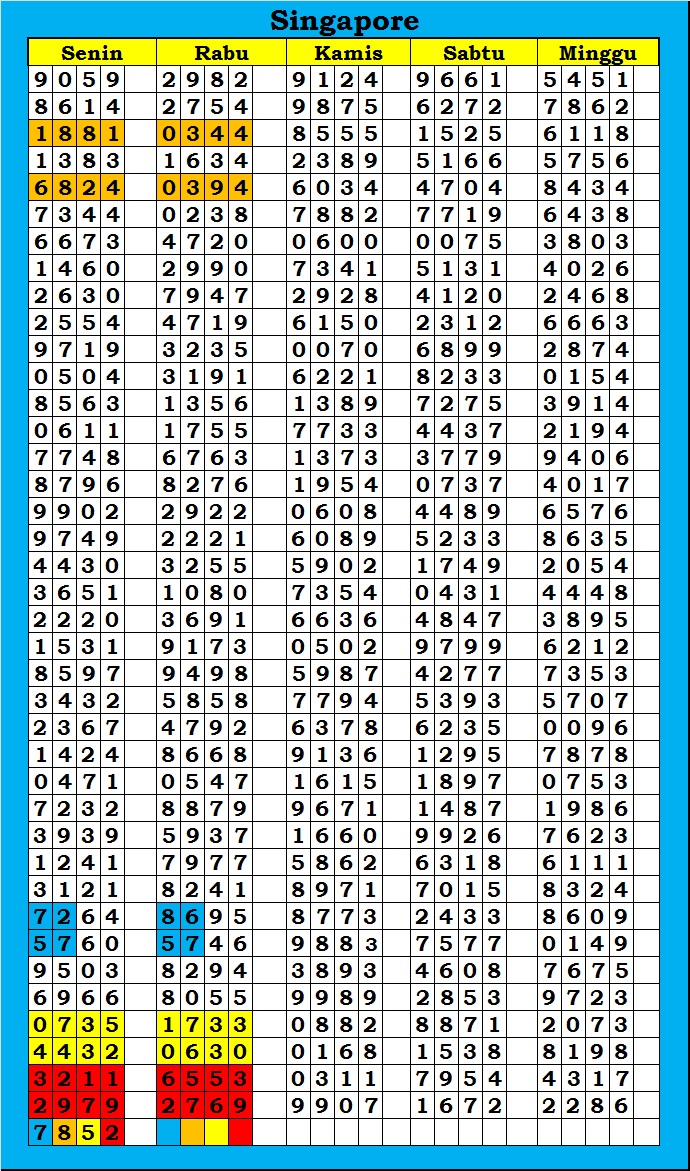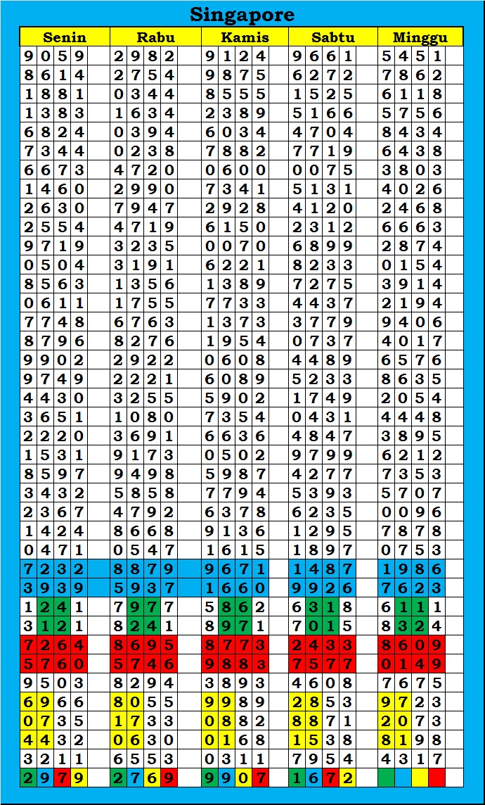 MASTER SINGAPURA Minggu, 26-04-2026 Merupakan Prediksi Otomatis yang menggabungkan Metode Kalender Togel Dengan Rumus-rumus kontrol yang sudah terbukti keakuratanya.Gunakan Aplikasi Rekap untuk mendapatkan LN TOP. Harap Maklum Jika kadang meleset MASTER SINGAPURA kita. Jadikan ini sebagai perbandingan saja dan tetap UPS