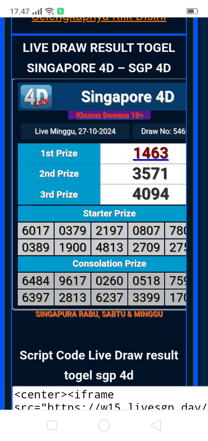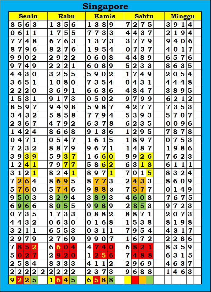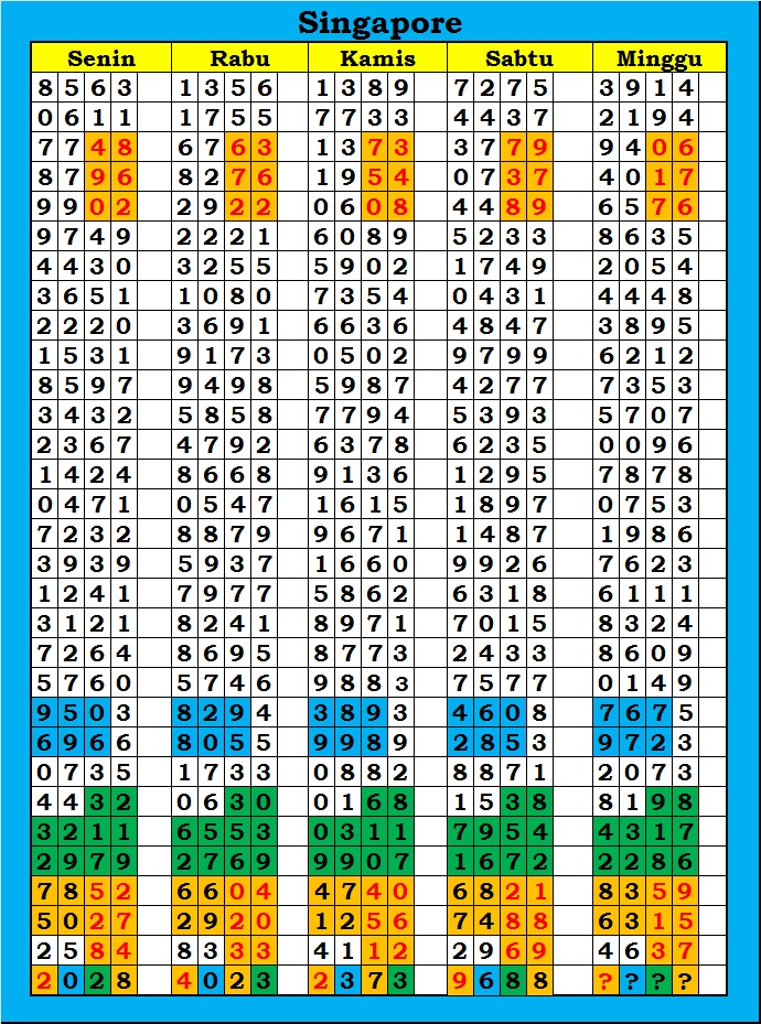 MASTER SINGAPURA Minggu, 26-04-2026 Merupakan Prediksi Otomatis yang menggabungkan Metode Kalender Togel Dengan Rumus-rumus kontrol yang sudah terbukti keakuratanya.Gunakan Aplikasi Rekap untuk mendapatkan LN TOP. Harap Maklum Jika kadang meleset MASTER SINGAPURA kita. Jadikan ini sebagai perbandingan saja dan tetap UPS